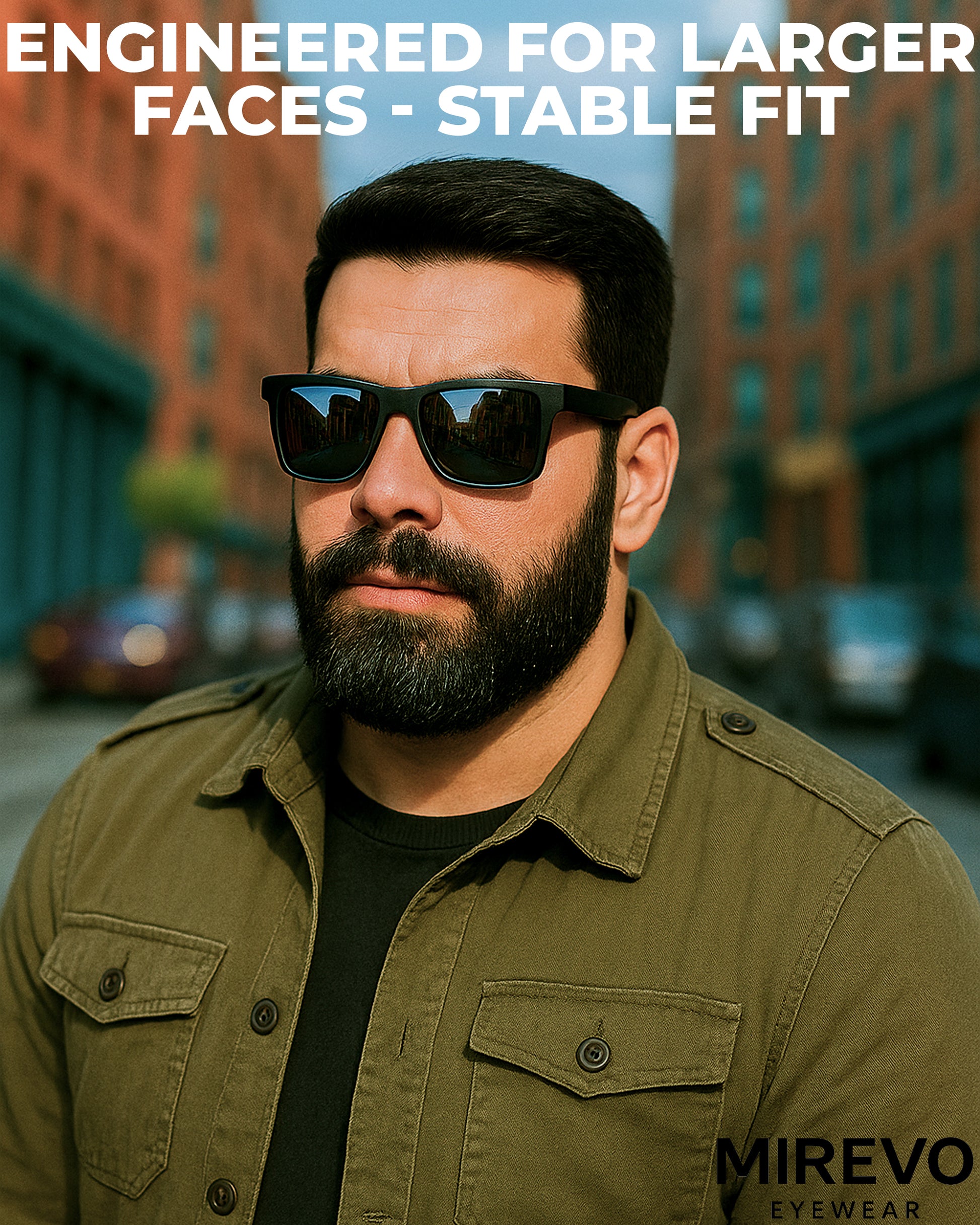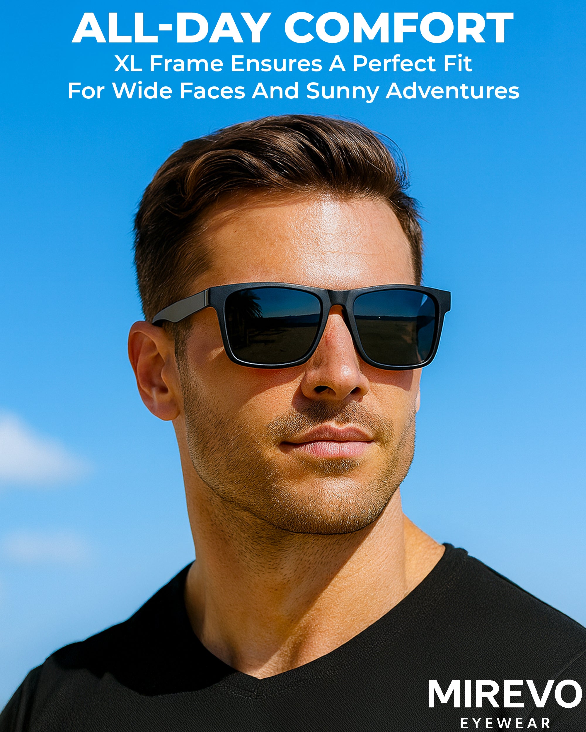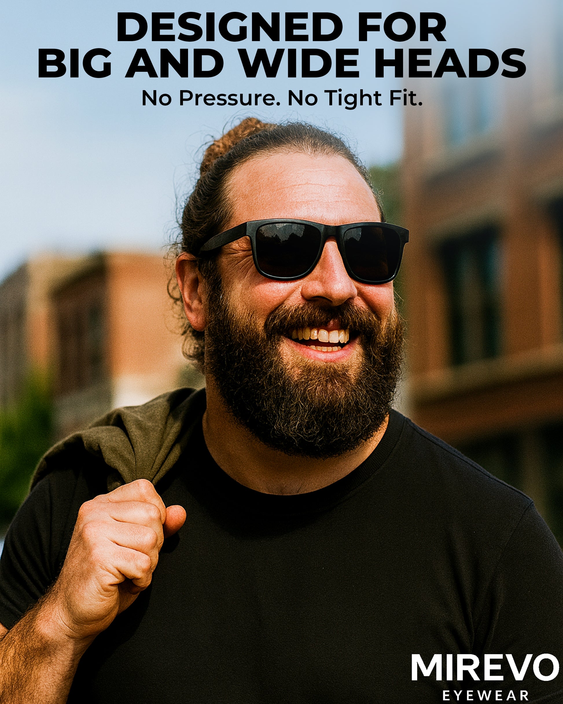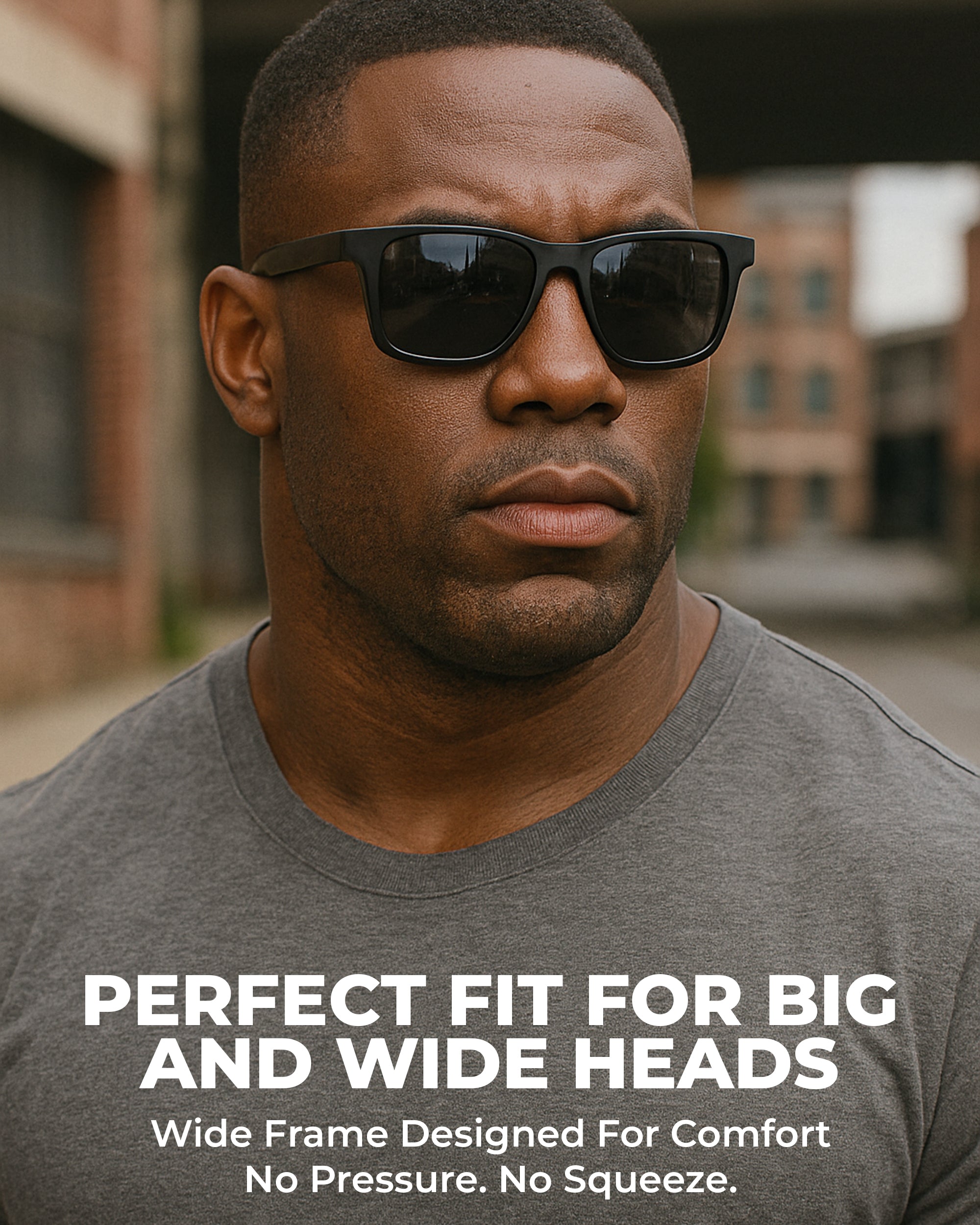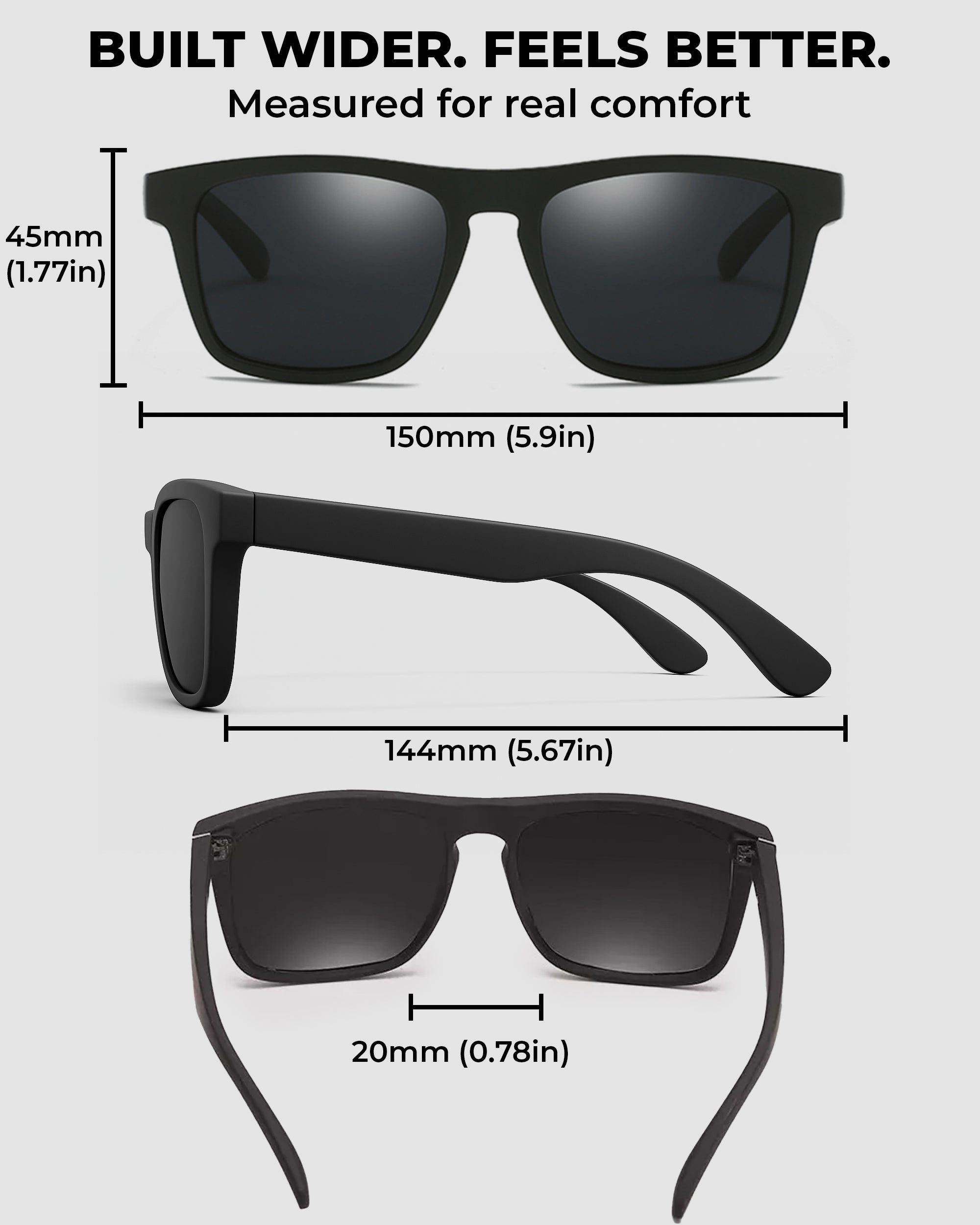 - PERFECT FIT FOR BIG AND WIDE HEADS : Frame Width: 150 mm | Lens Height: 45 mm | Lens Width: 55 mm | Nose Bridge: 20 mm | Temple Length: 144 mm. Designed specifically for men with big or wide heads, ensuring a stable, comfortable fit without pressure on the temples or nose bridge. Ideal choice for those looking for XXL, XL, or oversized sunglasses that truly fit.